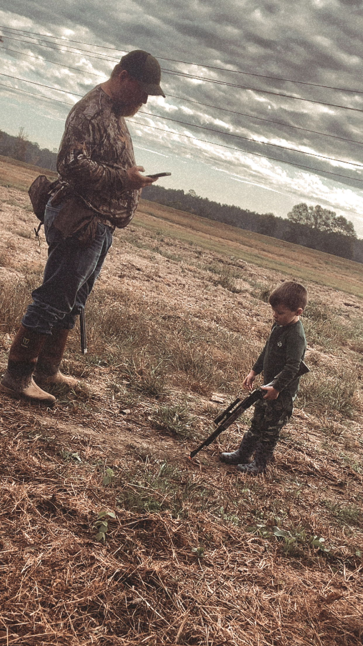 This is Braxton and his daddy! We took him Dove hunting for first time! He enjoyed it! He had his little lawn chair and toy gun! Making memories because it don’t last forever.