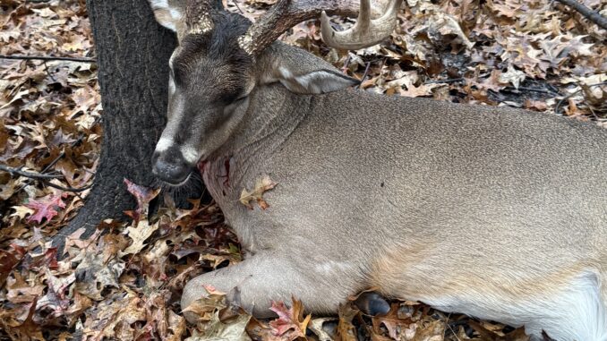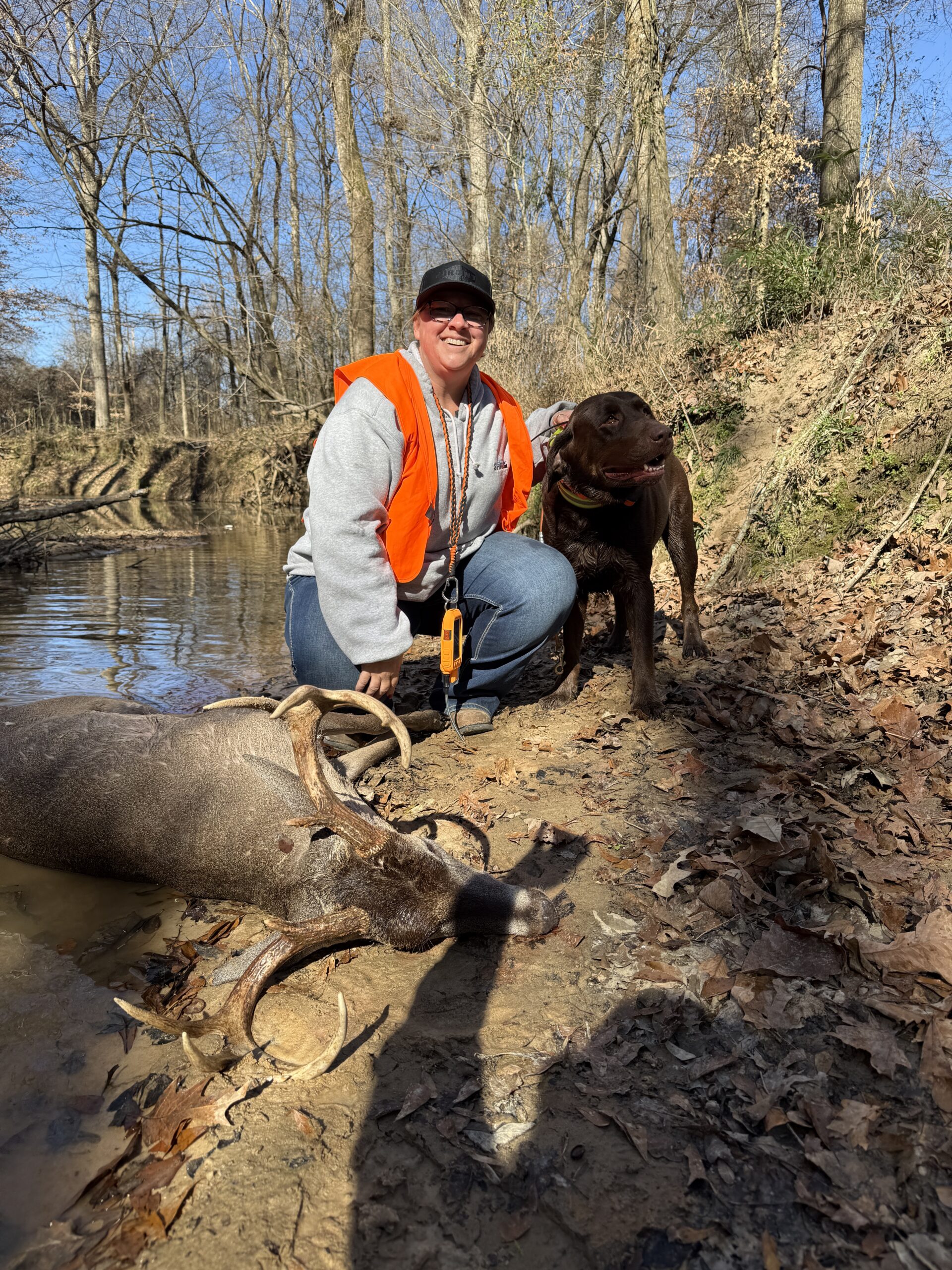 Hunter called stating he needed help tracking his Big Buck. He was unable to find blood so he was very discouraged thinking he had missed a lifetime trophy buck. We arrived promptly to increase our chances of putting the brakes on this buck. Kota, Rocky Hill Game Recovery’s 6 year old chocolate lab, jumped into action. After tracking over 800 yards, Kota put on a chase & was able to bay the buck in the creek.