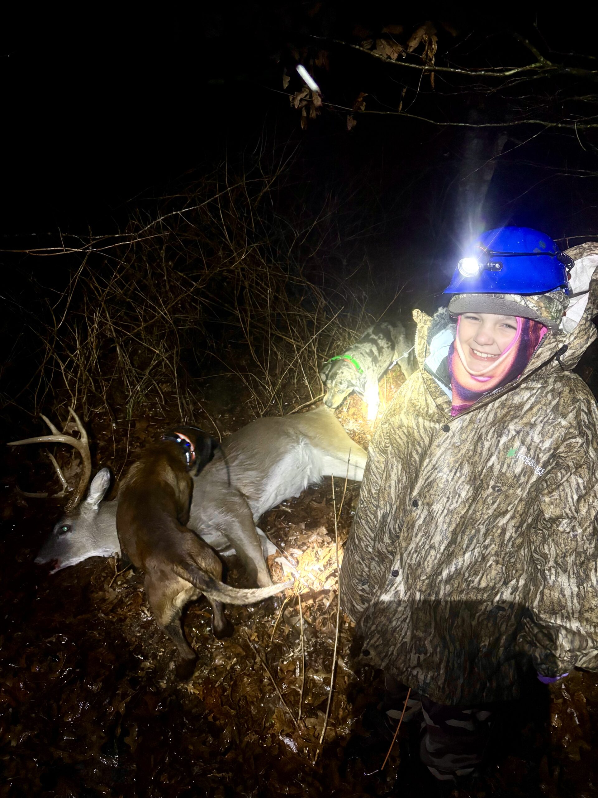 Emry has recently become interested in her dad’s tracking hobby. He finally allowed her to go and she tracked through all the woods with him and help track the dogs on the hand held and right out the gate with her first track she found the deer and the nice man paid her for her help in finding it.
