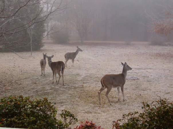 In this photo, I was drinking coffee on my front porch when I saw these does heading my way. The area they are standing in is under a Crabapple tree and there were several on the ground. Columbia, Mississippi.